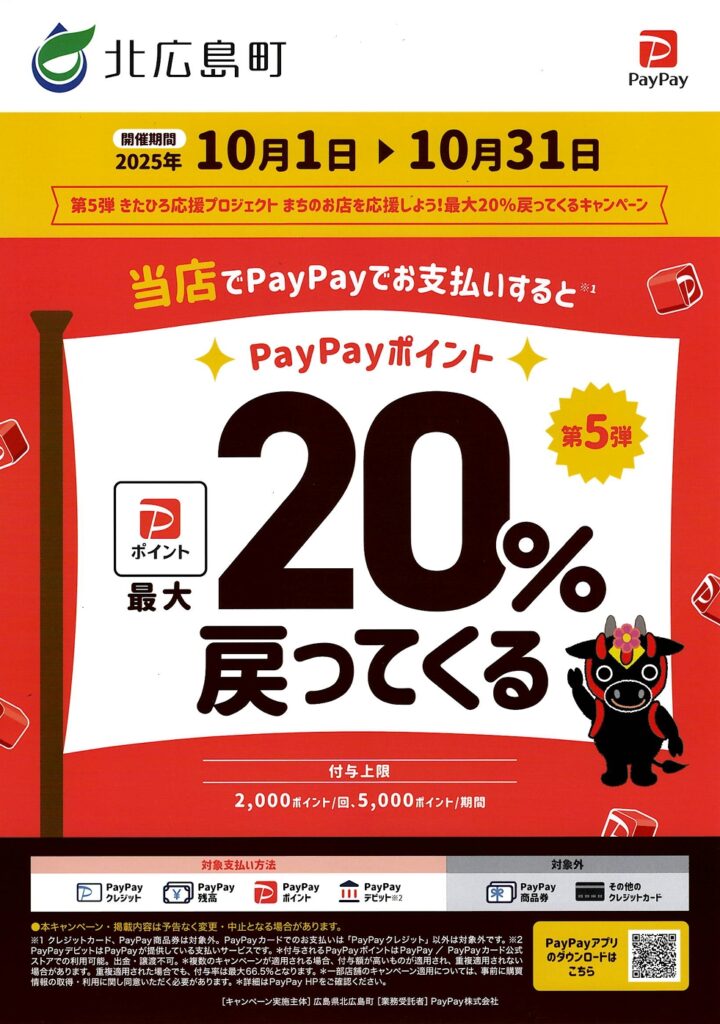 10月はpaypayのお支払いがお得に!! paypayよりキャンペーンの案内がとどきました! paypayでのお支払いは、最大20%がポイントで戻ってくるキャンペーンです。10月31日までとなっておりますが、早期に終了する場合もあるようです。ご利用は、早い方がよさそうですね! 詳細は…第5弾 きたひろ応援プロジェクト まちのお店を応援しよう!最大20%戻ってくるキャンペーン – キャッシュレス決済のPayPay